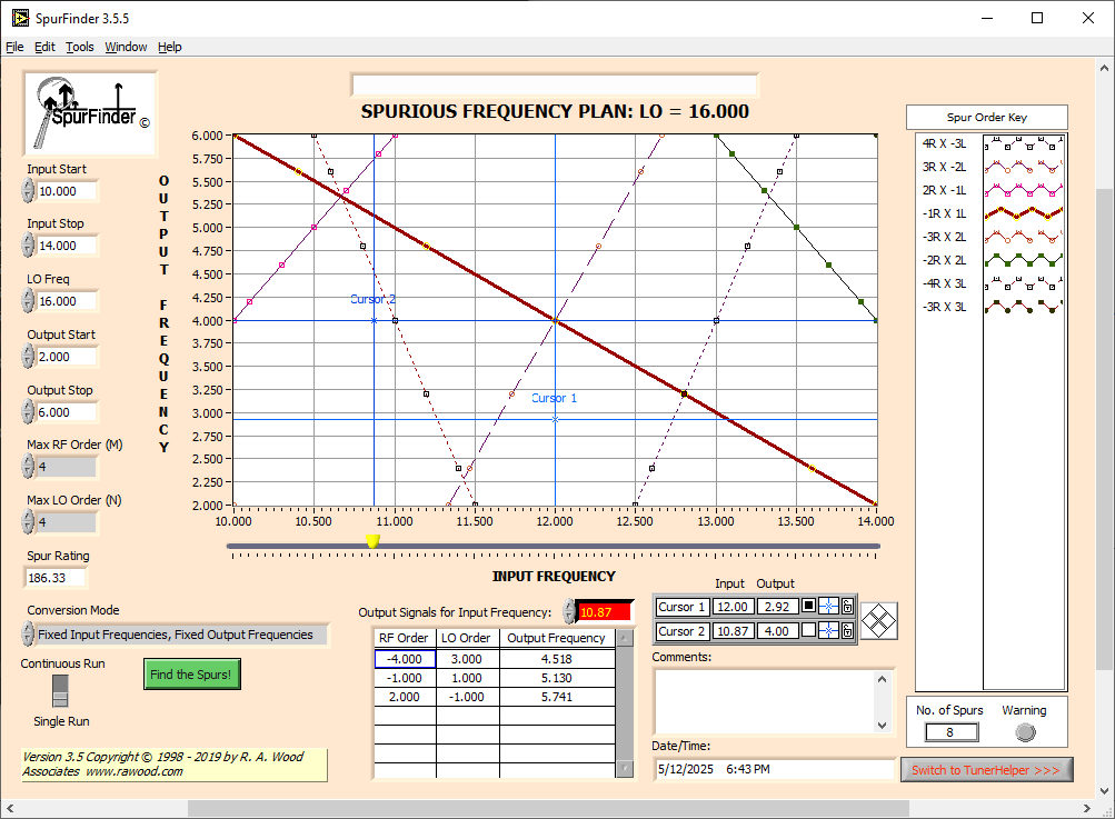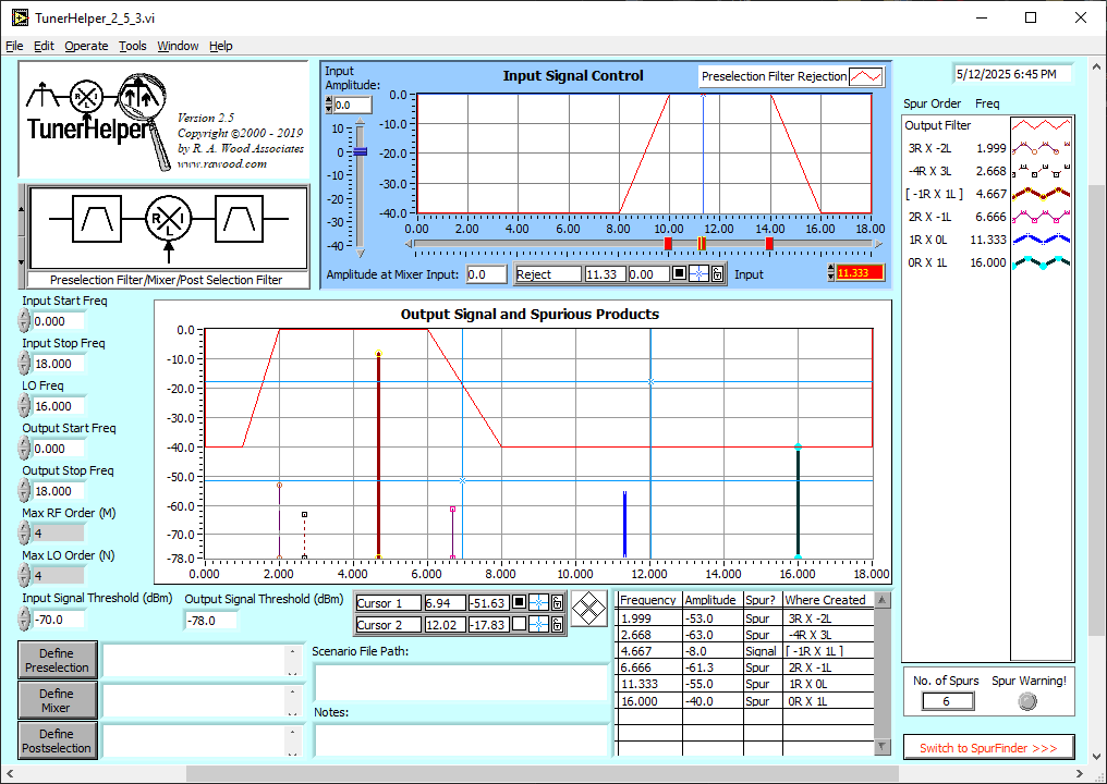 TunerHelper aids in the design of a receiver or transmitter frequency conversion scheme by providing a user friendly interface for analysis. Specify the input pre-selection filter requirements, the mixer spurious requirements, the leakage requirements, and the output post - selection filter requirements to view the signals and spurious products in your design. The program allows the user to determine all output signal and spurious products for any input frequency and amplitude. All filter and mixer parameters may be saved to files for use in other conversion schemes.